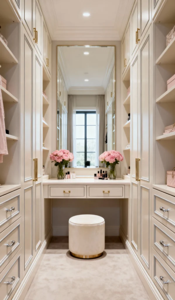 This is the ultimate “Elegant Vanilla” retreat! The beautiful, creamy off-white cabinetry with those delicate gold handles creates such a soft, feminine look. The focus is right in the center with a beautifully designed vanity table, complete with a plush velvet stool. Placing the large mirror directly across from the window helps bounce natural light deeper into the space. The symmetrical shelving on both sides provides ample display and storage, keeping the whole room feeling incredibly neat and polished.