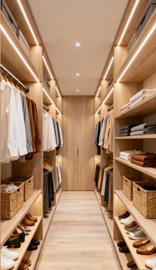 For those who love a clean, minimalist, and serene aesthetic, this “Light Wood” closet is perfection. The pale, natural wood grain keeps the long, narrow space feeling airy and modern. It’s all about function here—open shelving maximizes visibility, and the integrated strip lighting keeps every corner bright. I love how the woven baskets on the bottom shelves add a natural texture and keep shoes neatly tucked away. It’s a beautiful example of how an organized space can feel both simple and luxurious.