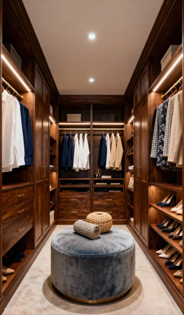 If you prefer a warmer, more classic feel, this “Rich Timber” walk-through closet is calling your name. The beautiful deep wood grain and symmetrical layout create a cozy, inviting atmosphere. Everything feels balanced, with hanging space and drawers on both sides. The lighting strips tucked under the shelves really highlight the wood’s richness. And how cute is that upholstered velvet ottoman? It adds a lovely softness to the center of the room and is a great place to sit or lay out outfits.