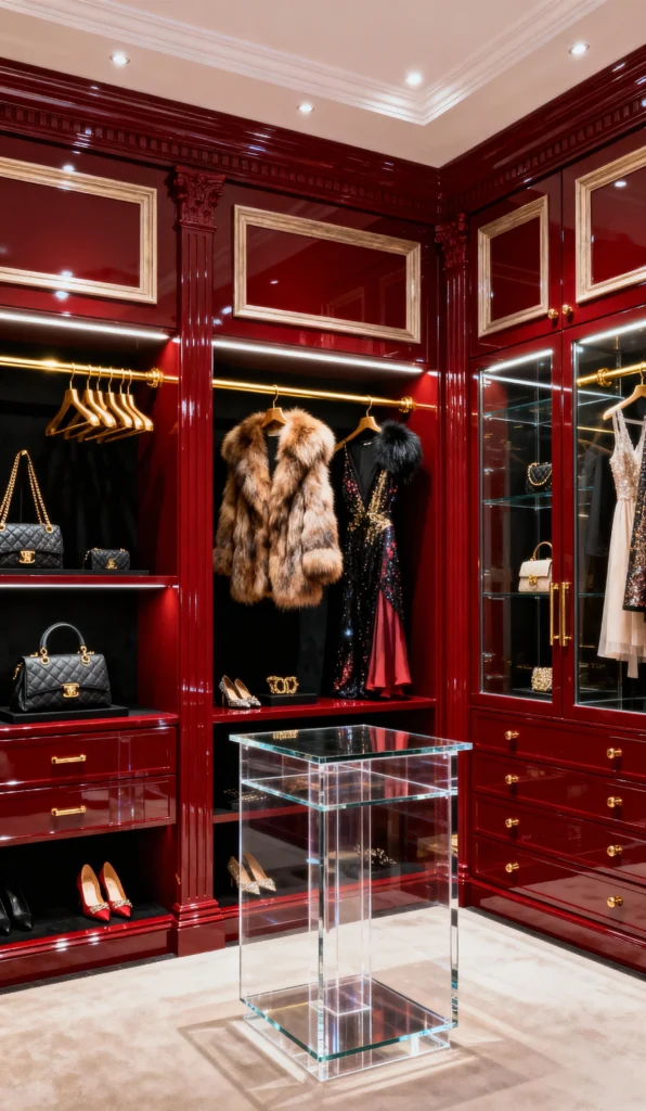 Talk about drama! This “Radiant Red” closet is pure glamour. The high-gloss finish on the deep cherry cabinets is incredibly luxurious and eye-catching. Everything here is designed to shine, from the gold-tone hanging rods and hangers to the mirrored cabinet sections. The clear, modern glass display pedestal in the center is perfect for showing off a prized accessory, making it feel like a private museum exhibit. This is a closet for someone who is bold and not afraid of a little (or a lot) of sparkle and shine!