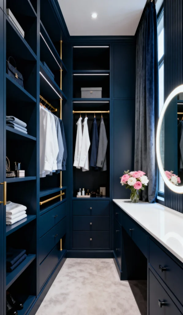 Here’s another gorgeous take on the dark closet trend—a stunning “Deep Navy” blue that just radiates elegance. This design smartly incorporates a dedicated vanity or dressing table with a bright white surface and a chic round mirror, making it a multi-functional space. The gold hanging rods and handles really pop against the deep color. It feels cohesive, with hanging sections, drawers, and open shelving all designed to maximize storage in this smaller walk-in. The textured curtains are a lovely, soft finish.