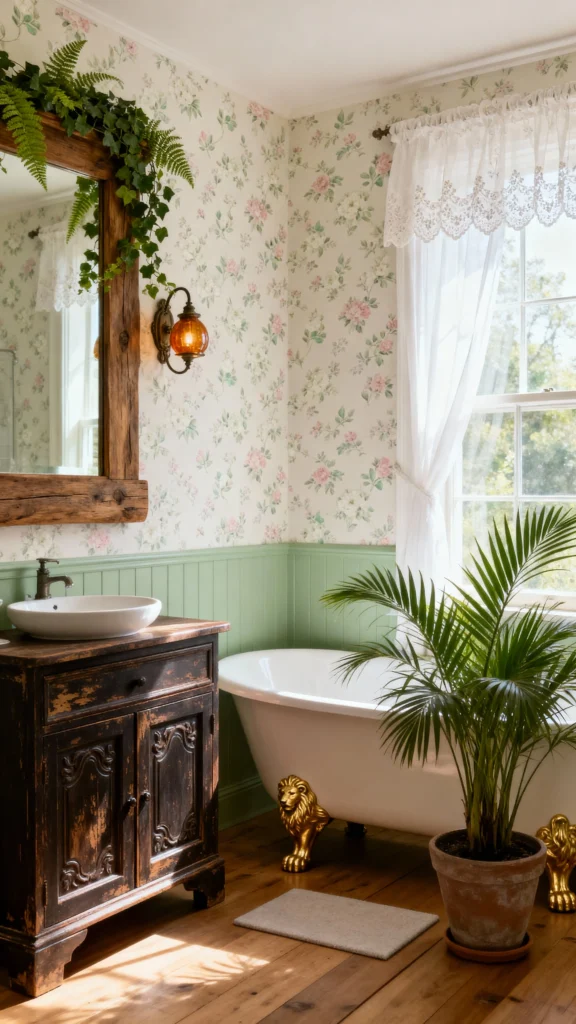 This room has a wonderful deep, earthy feel to it! The delicate floral wallpaper is beautifully balanced by the dark, rustic wood vanity and the thick, raw wood mirror frame—look at that rich grain! The bright green ferns and the large palm plant bring in a lush, forest-like vibe, complemented by the sage green wainscoting. The little lion-paw feet on the tub are such a charming detail! It truly feels like a secret, secluded garden bath.