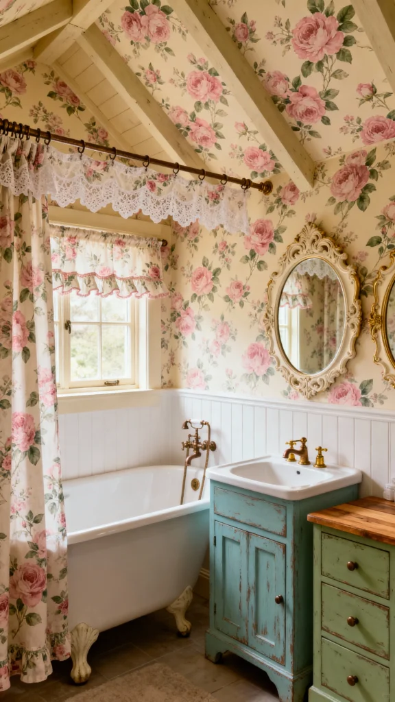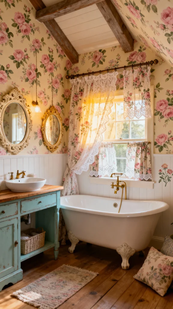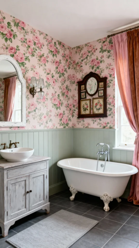 This room is giving me serious antique vibes! The combination of the pink floral wallpaper and the calming sage green wainscoting is just stunning. Notice how the distressed, almost white vanity and the dark, moody floor tiles ground the space, keeping the florals from feeling too sweet. The heavy, velvet-look curtain in that deep rose color adds such a luxurious, dramatic touch. It’s the perfect blend of cozy farmhouse and elegant Victorian! I could spend hours soaking in that beautiful clawfoot tub.