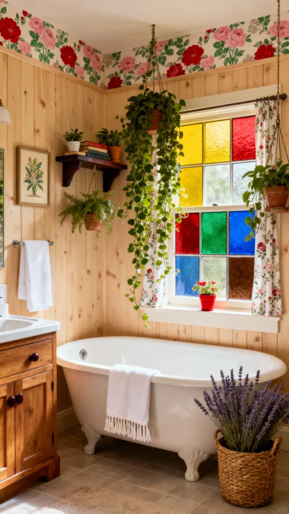 Ready for a little twist? This space blends Cottagecore with some serious Bohemian flair! The wood paneling gives it a rustic cabin feel, but the bold red floral border and that incredible stained glass window totally transform the mood. And all the plants! The cascading greenery brings the outdoors in, creating a vibrant, earthy space. It feels happy, cozy, and completely unique—a perfect retreat for a long, warm soak.