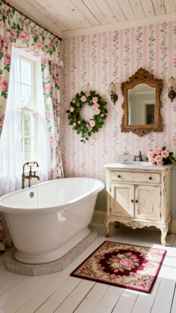 If you’re looking for something bright but still utterly romantic, check this out! The pale yellow wallpaper with pink roses feels so cheerful. But the real star is the mint green vanity—it’s such a lovely, soft accent color against the white beadboard paneling. The gold accents, from the lion-paw tub feet to the elaborate chandelier and mirror, give this bathroom a truly regal, opulent touch. And that rug? It ties all the colors together perfectly!
