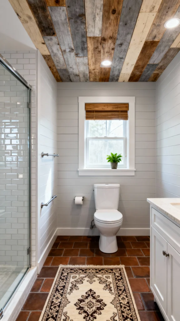 Just to show you another take on rustic charm, let’s look at this one! This is a great example of a Modern Farmhouse aesthetic. The white shiplap walls and subway tile shower are crisp and clean, but the reclaimed wood ceiling adds that rustic, warm texture we love. It’s less floral, but the natural materials keep that cozy feeling. The terracotta floor tiles and the woven rug add warmth underfoot. It’s clean, functional, and still full of personality!