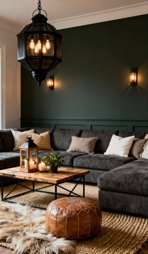 For those who love a moody vibe, check this out! The deep hunter green wall and dark sectional are both dramatic and surprisingly cozy. The textures are doing all the heavy lifting: the woven jute rug, the fluffy fur throw, and the distressed leather pouf. That striking, oversized black lantern chandelier casts such a warm, inviting glow, perfectly highlighting the rustic wood and metal coffee table. It’s sophisticated cozy!
