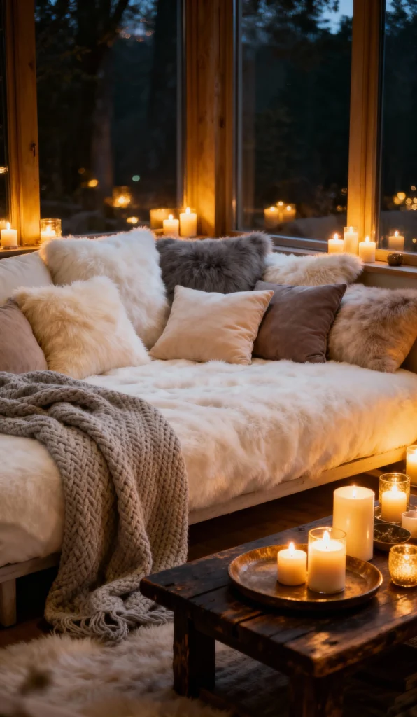 This is basically a nest! Covered completely in faux fur and plush throws, this seating area is the definition of comfort. The warm light from the wall of windows and the dozens of candles creates an incredibly intimate and inviting sanctuary. It proves that layering soft, luxurious materials is the quickest way to create a cozy, irresistible space for chilling out.