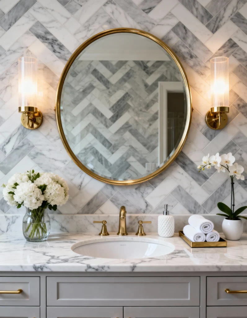 This vanity area is pure sophistication. The combination of the gray vanity, white marble countertop, and that stunning chevron (or herringbone) marble tile backsplash is just flawless. And those brass accents? The oval mirror frame, the elegant sconces, and the faucet—they all work together to add warmth and a touch of timeless glamour. It feels classic yet totally chic. This is the perfect example of how great lighting and a killer tile pattern can transform a space!