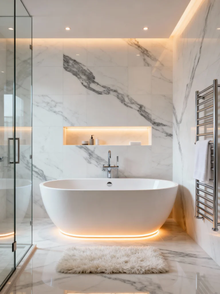 The floor-to-ceiling white marble walls create an incredibly bright and opulent atmosphere. The star of the show is that sleek, freestanding tub, accentuated by hidden LED lighting underneath—it gives it a magical, floating effect! The illuminated shower niche and the polished chrome towel warmer complete the spa experience. It’s minimalist design executed perfectly, focusing on material quality and ambient lighting to achieve ultimate relaxation.