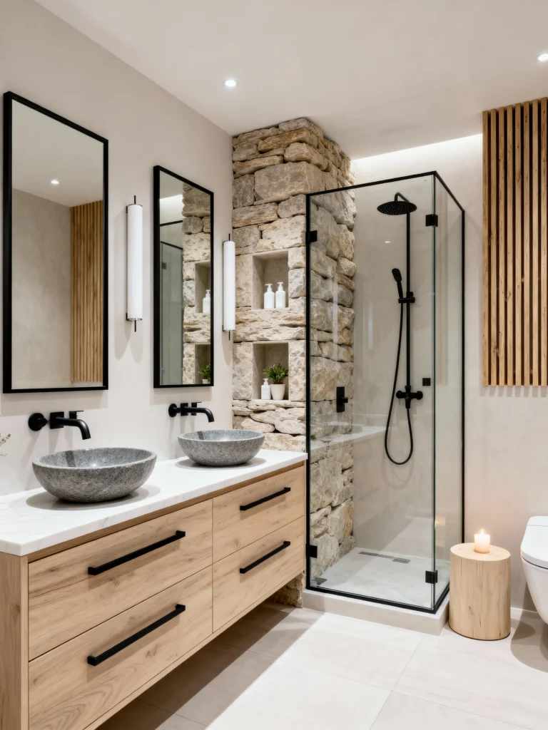 This bathroom is a true cave-like retreat—in the best way possible! The stacked natural stone walls are the absolute focal point, giving the room a rugged, grounding, and incredibly textural feel. The dark floating wood vanity provides a nice contrast to the stone. Notice how the linear lighting strip under the vanity and along the shower niche adds a modern, almost ethereal glow? Coupled with the sleek black fixtures and round mirror, it’s an incredibly sophisticated and spa-like space.