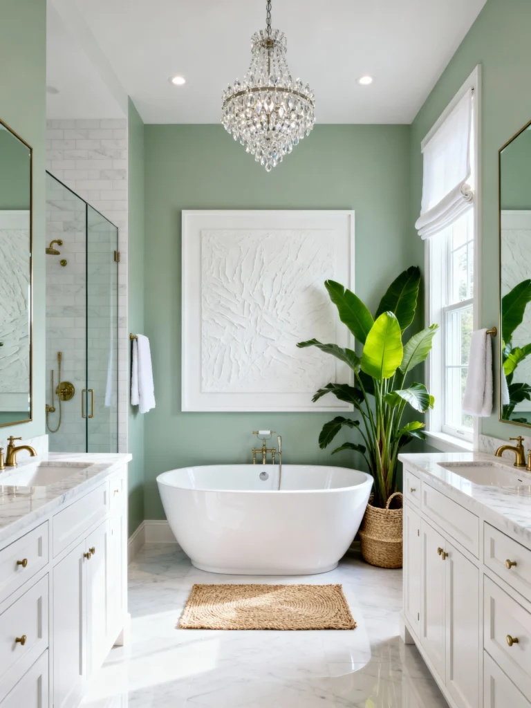 The soft, sage green walls are the perfect color choice—they’re calming without being boring. The freestanding bathtub is a showstopper on its own, but then they added that spectacular crystal chandelier! It’s such a bold, beautiful pairing with the clean white marble floors and vanities. Plus, the brass fixtures and massive tropical plant bring in a wonderful pop of life. It feels like a beautiful, sun-drenched, and utterly luxurious space to unwind.