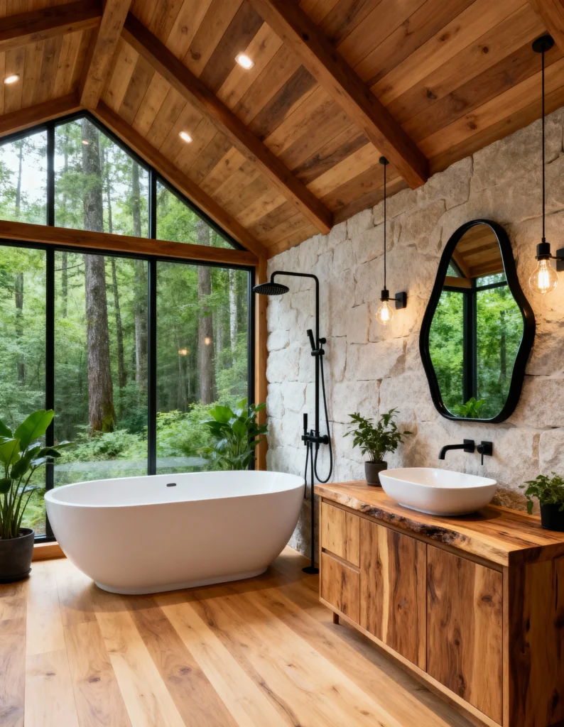 Okay, imagine waking up and seeing this! this bathroom is a nature lover’s dream. The high, sloped wood ceiling and the expansive window overlooking the trees connect the indoors and outdoors seamlessly—it’s like being in a luxury treehouse. The simple, clean lines of the white freestanding tub and vessel sink contrast beautifully with the rustic stacked stone accent wall and the chunky, live-edge wood vanity. It’s got a perfect mix of cozy, rustic charm and modern, minimalist design. Seriously zen!