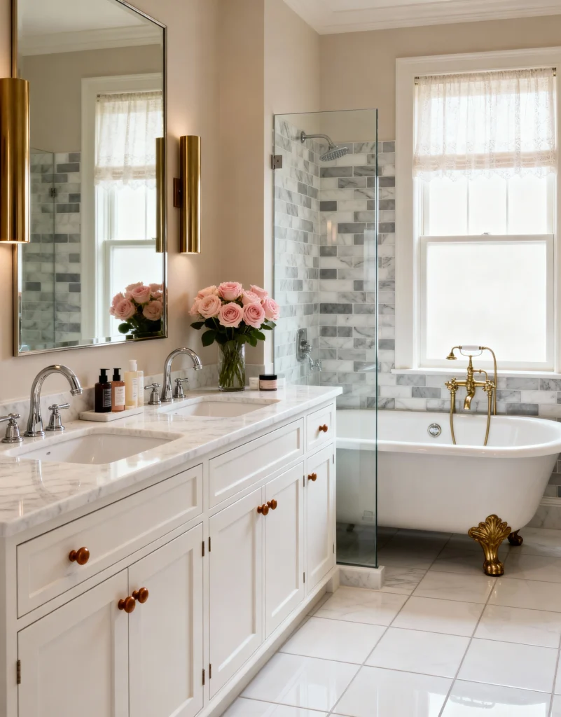 This bathroom,, just screams classic elegance with a hint of vintage flair! The dual white vanity with a marble countertop looks so crisp, and the warm, golden accents on the lighting and that stunning clawfoot tub really elevate the space. The shower features a subway-style marble tile, which adds another layer of texture without overwhelming the room. Plus, that window with the delicate lace curtain brightens everything up and adds a sweet, timeless charm. It’s a beautifully bright and romantic spot!