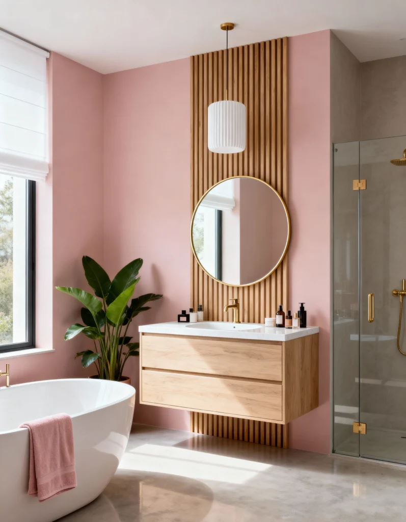 The soft blush pink walls bring in a playful yet sophisticated energy, and I am loving the vertical wood slat panel that acts as a stunning backdrop for the mirror and floating vanity. It’s a fantastic way to add texture and define the vanity area! The clean, white floating vanity keeps the look modern and airy. With those subtle brass fixtures and the geometric pendant light, this space feels effortlessly contemporary and super stylish.