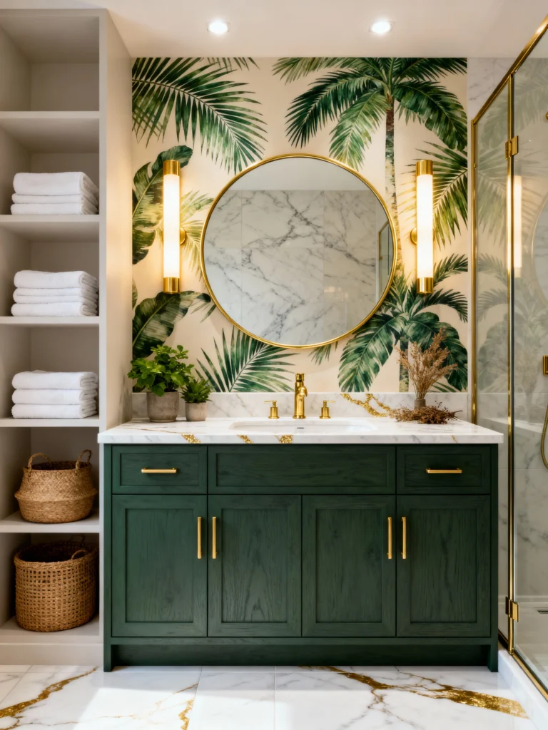 Get ready for some serious tropical vibes! featuring oversized palm leaves, sets an instantly glamorous and vacation-like mood. That deep emerald green vanity with the gold hardware is simply stunning and perfectly complements the jungle theme. The gold-framed mirror and the chic cylindrical sconces enhance the luxurious feel. The marble countertop and floor with gold veining tie it all together, making this a truly bold, beautiful, and high-fashion bathroom.