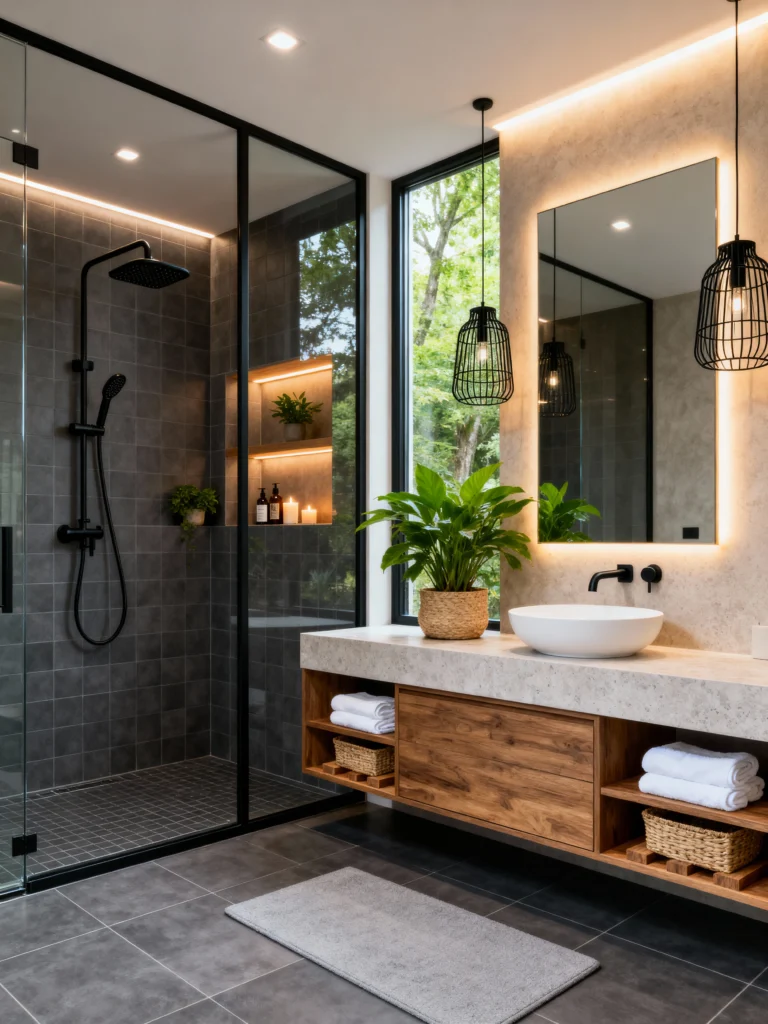 If you’re into darker, moodier aesthetics, The large, dark gray subway tiles in the shower and the matching floor tile create a sleek, modern envelope. The natural wood floating vanity and the large potted plant inject essential warmth and organic contrast into the gray palette. I love the illuminated mirror and those industrial cage pendant lights! It feels very modern, slightly masculine, and incredibly chic—a true urban sanctuary with a peek of nature outside the window.