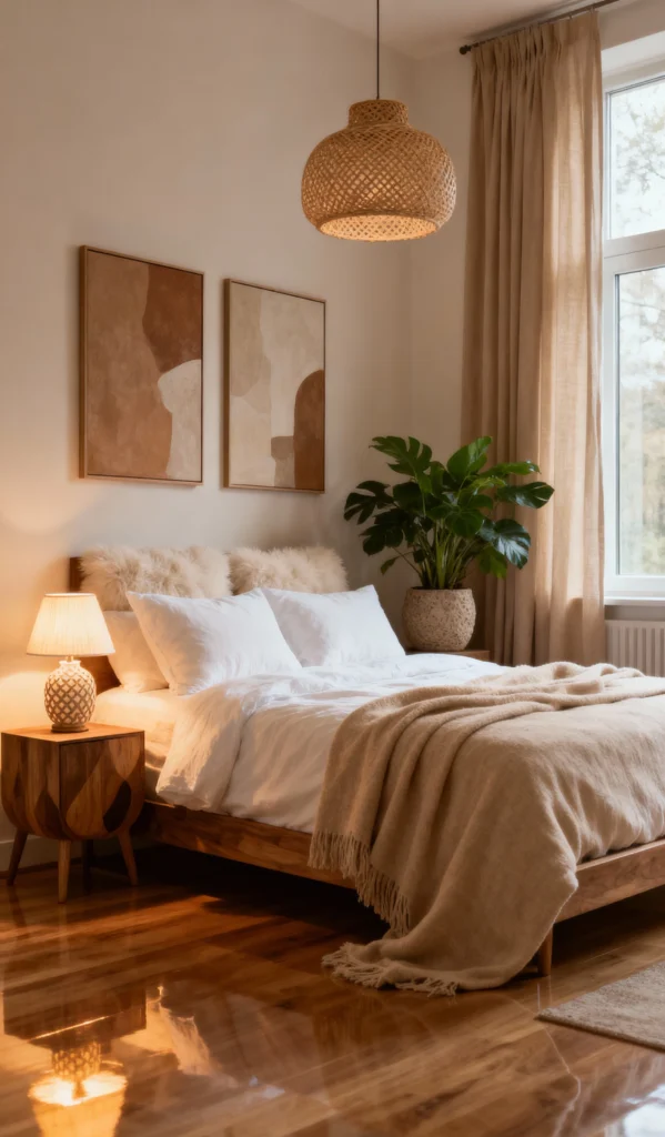 This space is pure calm. I love how the creamy walls and sheer curtains create a light, airy base, letting the rich textures of the natural wood bed frame and the glossy floor shine. The woven pendant light is a perfect bohemian touch, and that huge, healthy plant adds a pop of life. Notice the monochromatic art—it keeps things sophisticated and serene. It’s a masterclass in making a minimal palette feel incredibly cozy.