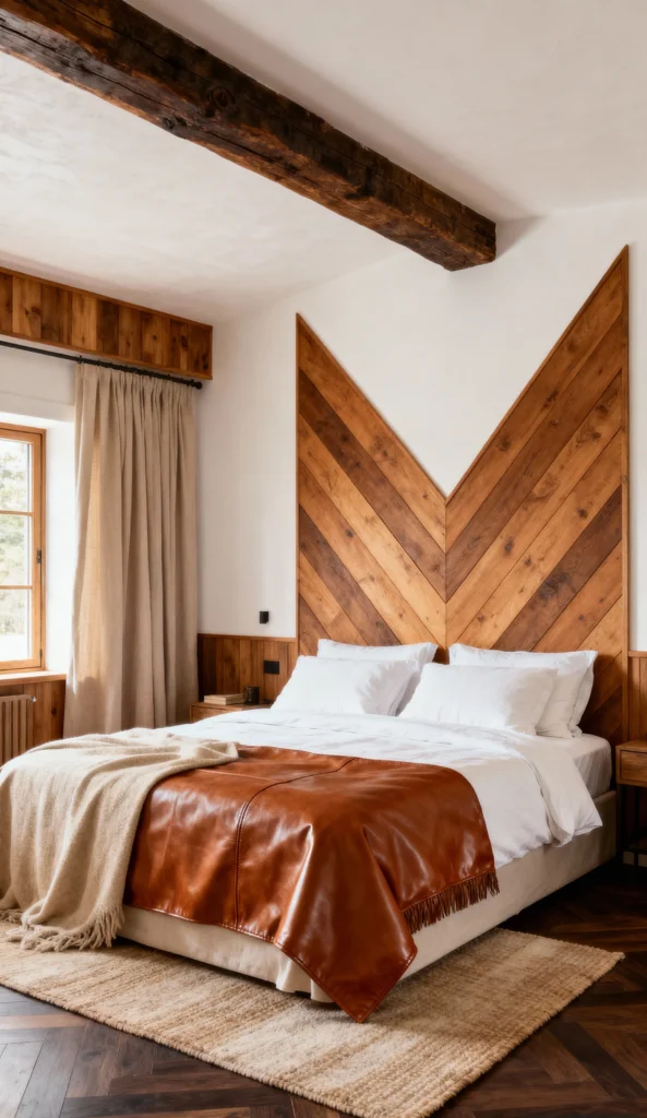 The architectural statement in this room is that incredible chevron-patterned wood headboard—it adds so much visual interest and a custom feel. The rough-hewn beam overhead complements the rustic vibe perfectly. Layering in that deep, warm brown leather throw is genius; it adds a rich texture and color pop against the crisp white bedding. This room makes me want to grab a book and stay awhile!