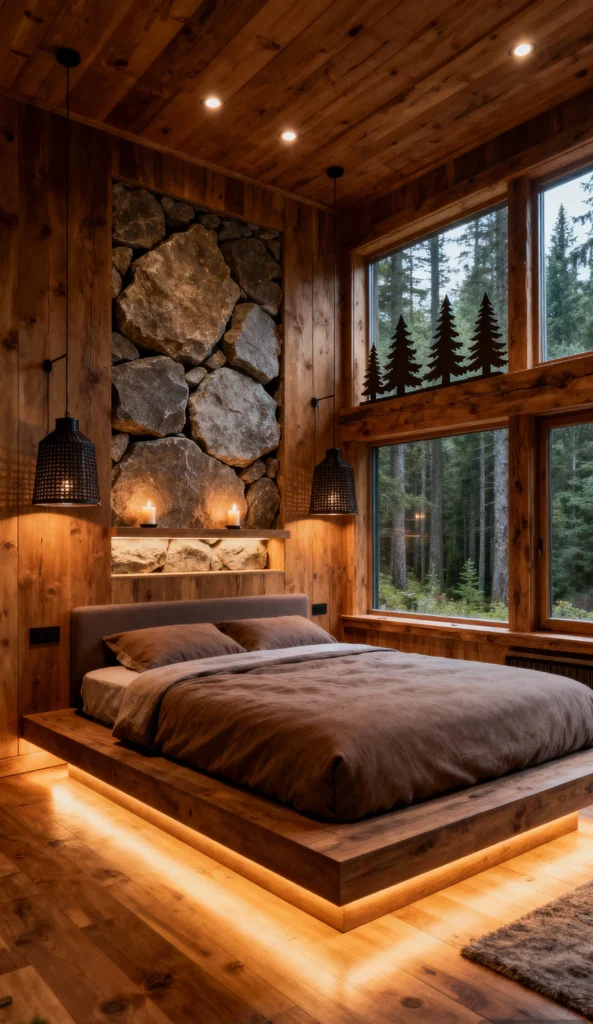This is the ultimate cozy cabin! The warmth of the wood-paneled walls and ceiling is complemented beautifully by the raw, natural texture of the large stone accent wall. Floating the bed frame and adding subtle under-lighting is a clever way to modernize the rustic elements. And those massive windows with a forest view? Instant relaxation. It feels like a safe, warm haven tucked away in nature.