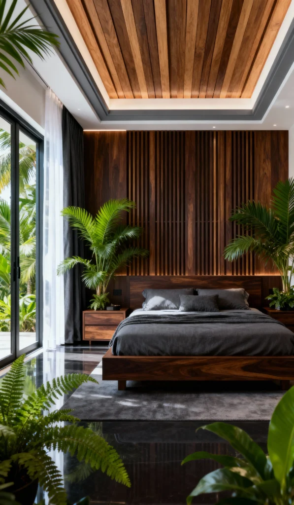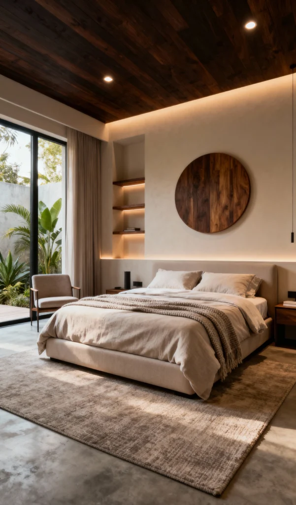 Talk about a dreamy vibe! This room feels like a high-end resort with its subtle, recessed lighting that highlights the textures. The dark, slatted wood ceiling adds immediate drama and warmth, contrasting beautifully with the light walls. My favorite detail is that massive, circular wood art piece above the bed. Paired with the floor-to-ceiling windows showing off the tropical greenery, this room is all about sophisticated tranquility.