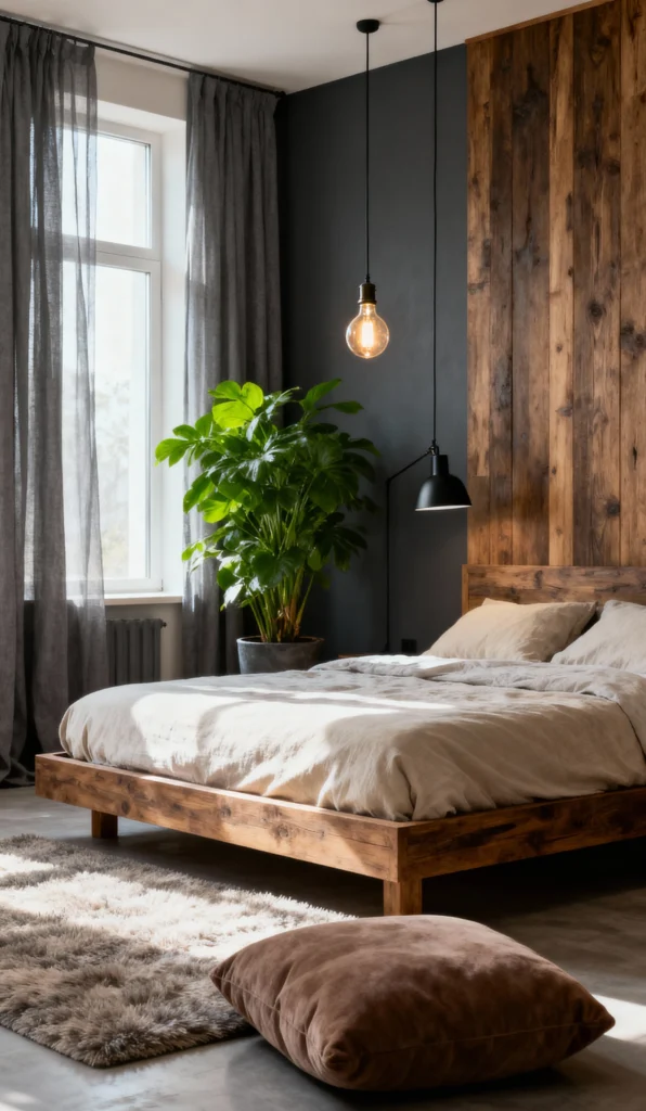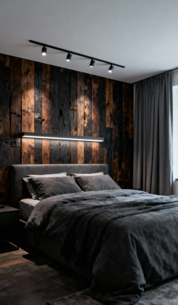 This room plays with light and dark so well! The dark gray feature wall is immediately grounding, but the light streaming in from the large window keeps it from feeling heavy. The standout feature is the vertical wood-slat accent wall that serves as the headboard. It injects a ton of rustic warmth into the otherwise modern, moody palette. That plush, fluffy rug looks like the perfect place to sink your toes.