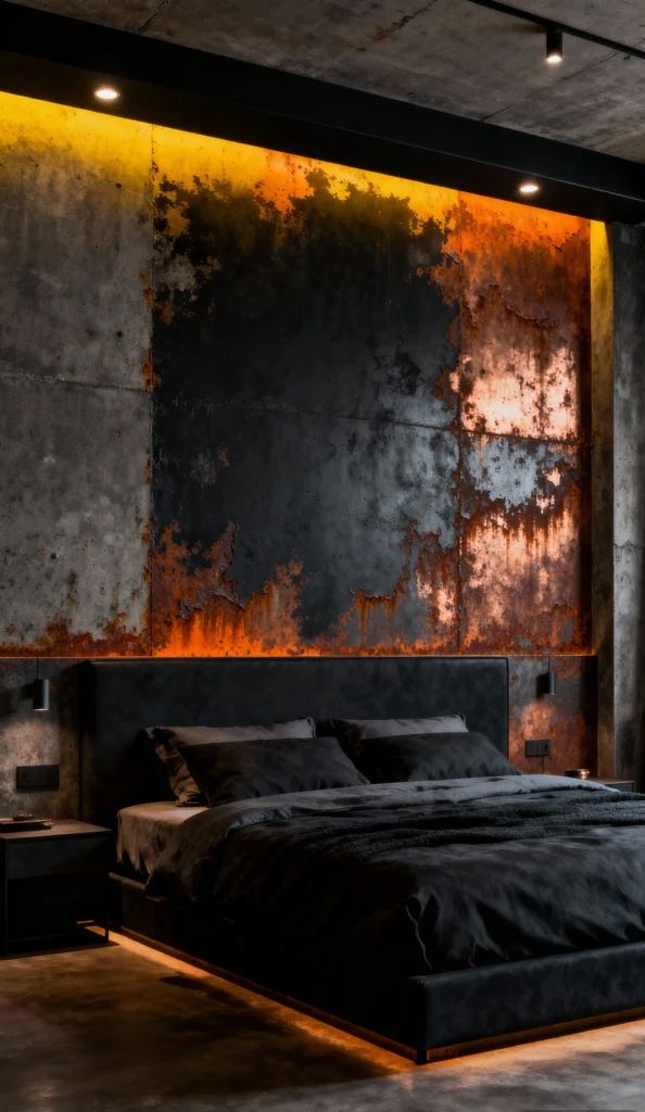 This room is for the bold among us! It perfectly nails the industrial, distressed look with that incredible accent wall, featuring a rusted, patina-like finish. The glowing orange uplighting behind the headboard enhances the fiery, dark tones. Everything else is kept sleek and monochromatic—black bedding, black walls—allowing that striking feature wall to be the absolute star of the show. Seriously cool.