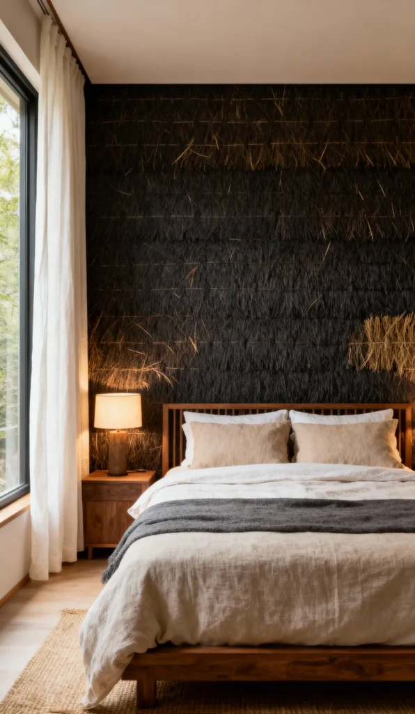 This room uses an incredibly rich, textured material—almost like woven grasses or hay—in a dark, earthy palette for a stunning backdrop. It gives the room a truly one-of-a-kind feel. Everything else is pared back with natural linen bedding and a simple wood bed frame, making that artistic accent wall the main focus. It’s rustic sophistication done right.