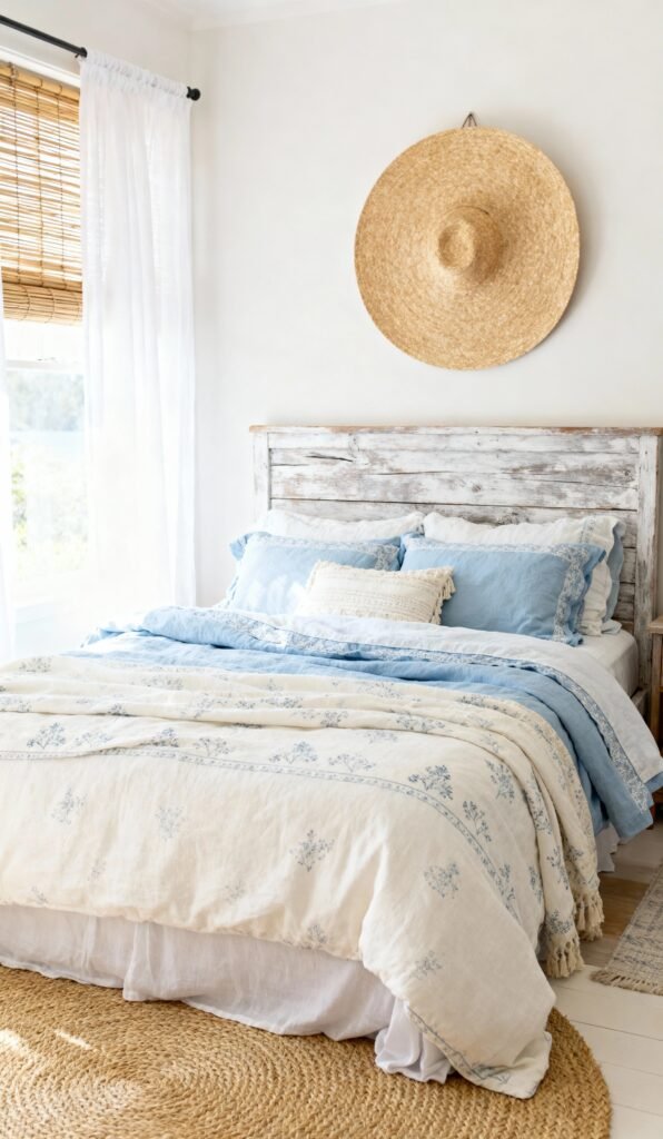 This room is pure, breezy coastal elegance! The light blue and white linen bedding looks so inviting, and the distressed, white-washed wooden headboard gives it that perfect, rustic beach-shack feel. The large, round jute rug anchors the space, adding natural texture, while the oversized straw hat hung above the bed is a super clever and charming piece of décor. It feels like stepping into a peaceful seaside cottage!