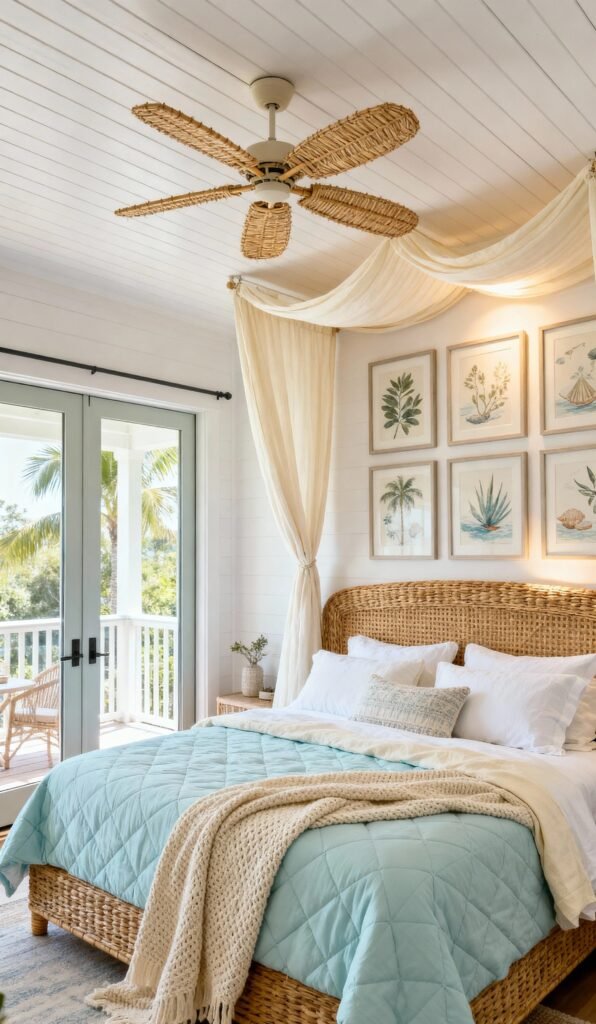 Talk about bright and airy! The combination of the crisp white shiplap walls and ceiling fan with the abundance of natural light makes this room feel huge and welcoming. The rattan bed is stunning, and the draped white fabric creates an instant canopy effect—so romantic! I love the gallery wall of botanical and coastal prints, and the soft aqua quilt provides just the right touch of color to complement the greenery visible through the French doors.