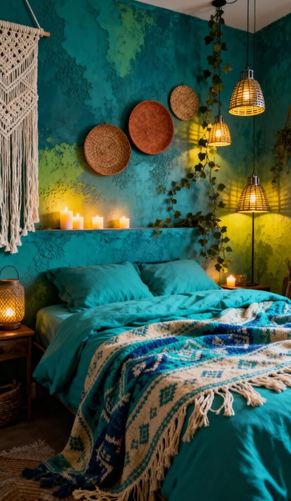 This bedroom is a little moodier and totally enchanting! The deeply textured wall with its rich mix of teal, turquoise, and lime green is stunning—it looks like a tropical lagoon. The soft lighting from the rattan pendant lamps and the warm glow of the candles create such a cozy, intimate vibe. I adore the climbing ivy detail and the chunky blue and white patterned blanket. It’s a bohemian dreamscape!