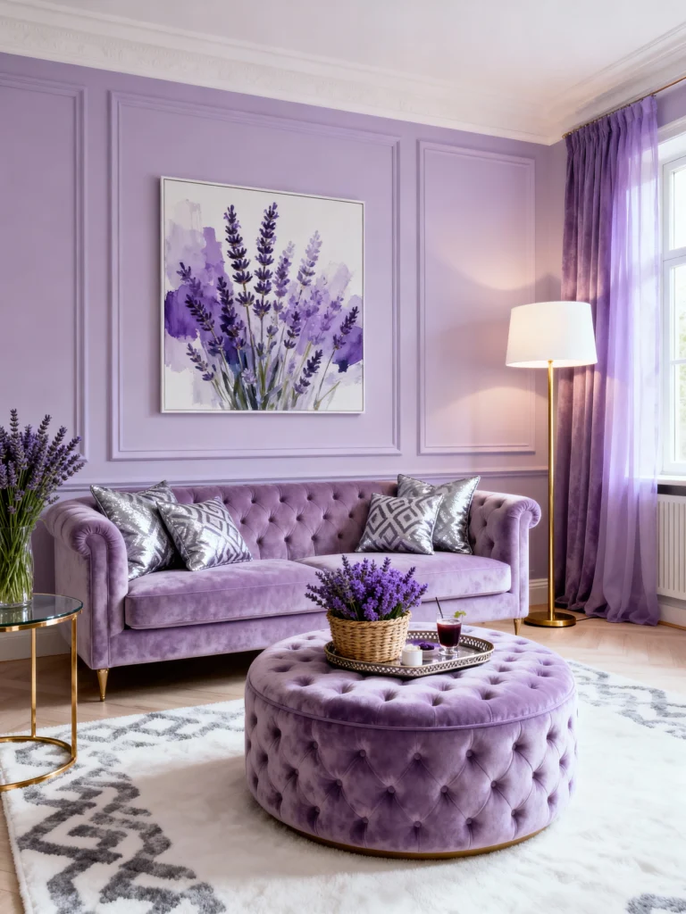 This room shows how to use velvet in a lighter, airier, and completely charming way! The monochrome palette of soft lilac and lavender creates an incredibly calming, almost dreamy feel. The sofa, still a beautiful tufted velvet, anchors the space in a subtle shade of purple. The wall paneling adds a nice architectural detail without being fussy, and the large lavender print perfectly complements the theme. Paired with minimalist gold accents—like the floor lamp and side table—and a fluffy white rug with a grey pattern, the room feels fresh, modern, and very sophisticated. This is velvet for the contemporary home, proving the fabric works just as well for peaceful sanctuary as it does for high drama.