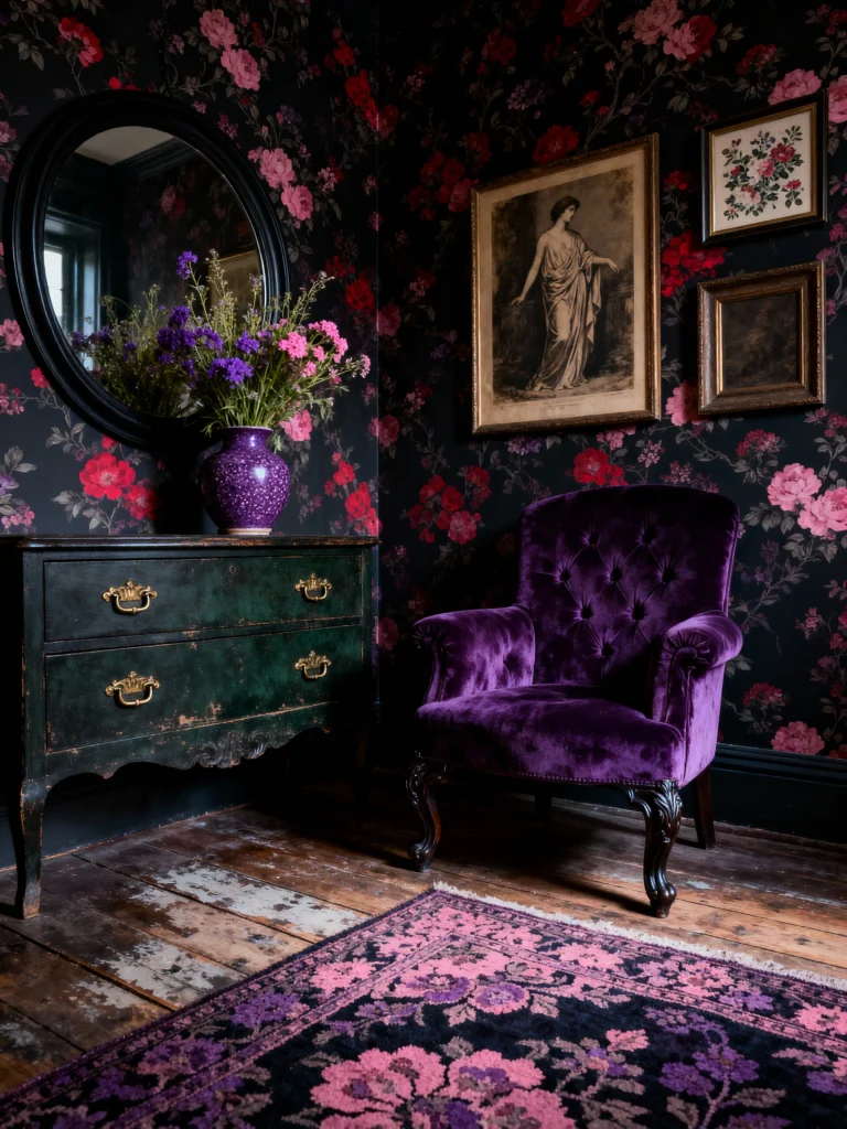 This is my favorite kind of moody—rich, dramatic, and intensely romantic! The dark floral wallpaper, featuring rich reds and pinks against a black background, gives this corner so much depth and character. It instantly feels intimate and cozy. The distressed, dark green dresser is such a fantastic antique piece, and its aged look contrasts beautifully with the pristine, plush purple velvet armchair. It’s styled perfectly with a simple, dark round mirror above the dresser, and a vase brimming with a slightly wild bouquet of flowers. Everything from the dark wood floors to the matching purple and black rug works together to create a space that feels deeply personal, atmospheric, and just a little bit rock ‘n’ roll.