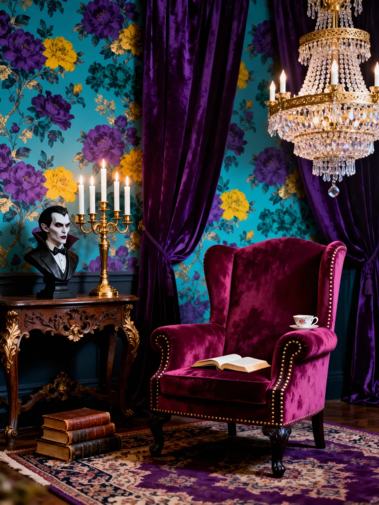 This room is pure dark academia meets haunted mansion chic, and I am obsessed. The pairing of that electric turquoise and teal wallpaper with those massive, deep purple and yellow floral prints is already a showstopper. But then you add the velvet—a single, stunning magenta wingback chair, framed by those heavy, luxurious purple velvet curtains. It feels regal and slightly spooky, especially with that bust of a certain iconic Count on the side table! The antique gold candelabra and the glittering crystal chandelier just ramp up the decadence. It’s a perfect example of how you can use bold patterns and heavy textures to create a space that’s both dramatic and cozy. Imagine curling up in that chair with one of those antique books and a tiny cup of tea. It’s a whole mood.