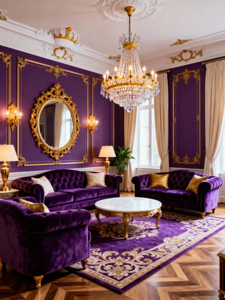 If a royal decree were issued demanding a room be built entirely out of luxury, this would be it! This space takes purple velvet and gold ornamentation to a truly palatial level. The walls are a striking, saturated aubergine color, beautifully set off by intricate gold paneling and trim—even the crown molding is dripping with detail. The tufted velvet sofas and armchair are the stars, promising unparalleled comfort, while the patterned rug grounds the space in varying shades of lavender and gold. Notice how the large, ornate gold mirror reflects the light from that absolutely massive crystal chandelier, making the entire room feel bright and expansive, despite the deep wall color. It’s undeniably grand, perfect for someone who believes “less is more” is an absolute lie!