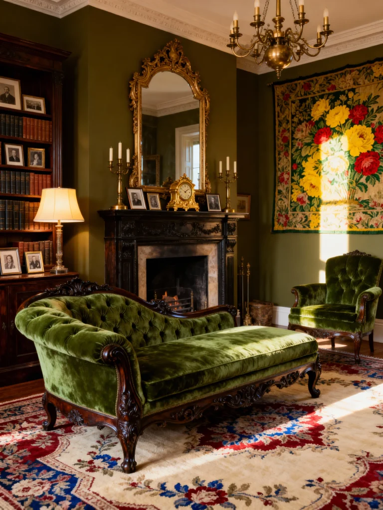 This room is a masterclass in using rich greens to create a deeply luxurious atmosphere. The olive-green walls provide a serene backdrop, allowing the centerpiece—a gorgeous, carved wood and tufted emerald green velvet chaise lounge—to really shine. It’s such a unique, decadent piece, perfect for lounging like true royalty. The fireplace mantel is striking and ornate, topped with a beautiful gold mirror and candelabras, while the antique tapestry on the wall brings in that incredible pop of yellow and red floral color. This space perfectly blends natural, earthy tones with highly detailed, traditional furniture. It feels sunlit, calming, and effortlessly chic, especially with that striking rug tying everything together.