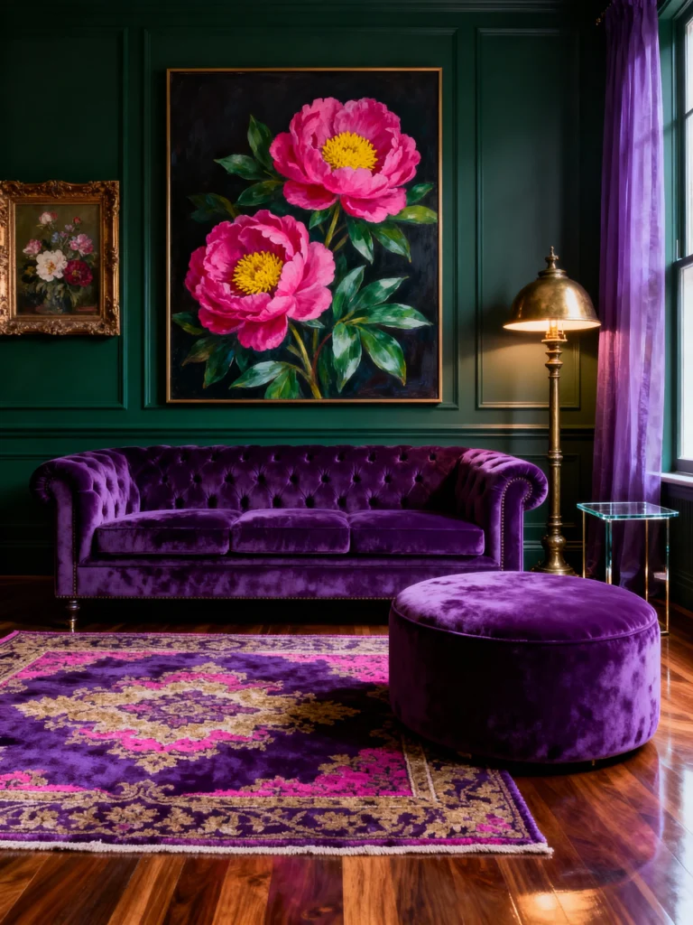 This room is a celebration of color and texture! The walls are painted a deep, sophisticated emerald green, which creates an absolutely stunning backdrop for that truly massive, modern floral painting with bright pink peonies. The vibrant artwork completely changes the mood. Below it, a majestic, deep purple velvet Chesterfield sofa and matching tufted ottoman anchor the room in luxury. The rug, bringing together shades of purple and pink against a dark base, ties the furniture and the artwork together beautifully. The rich, glossy wood floor and the brass lamp add warmth. This space shows how combining two highly saturated, jewel-toned colors—green and purple—can be incredibly harmonious and deeply glamorous.