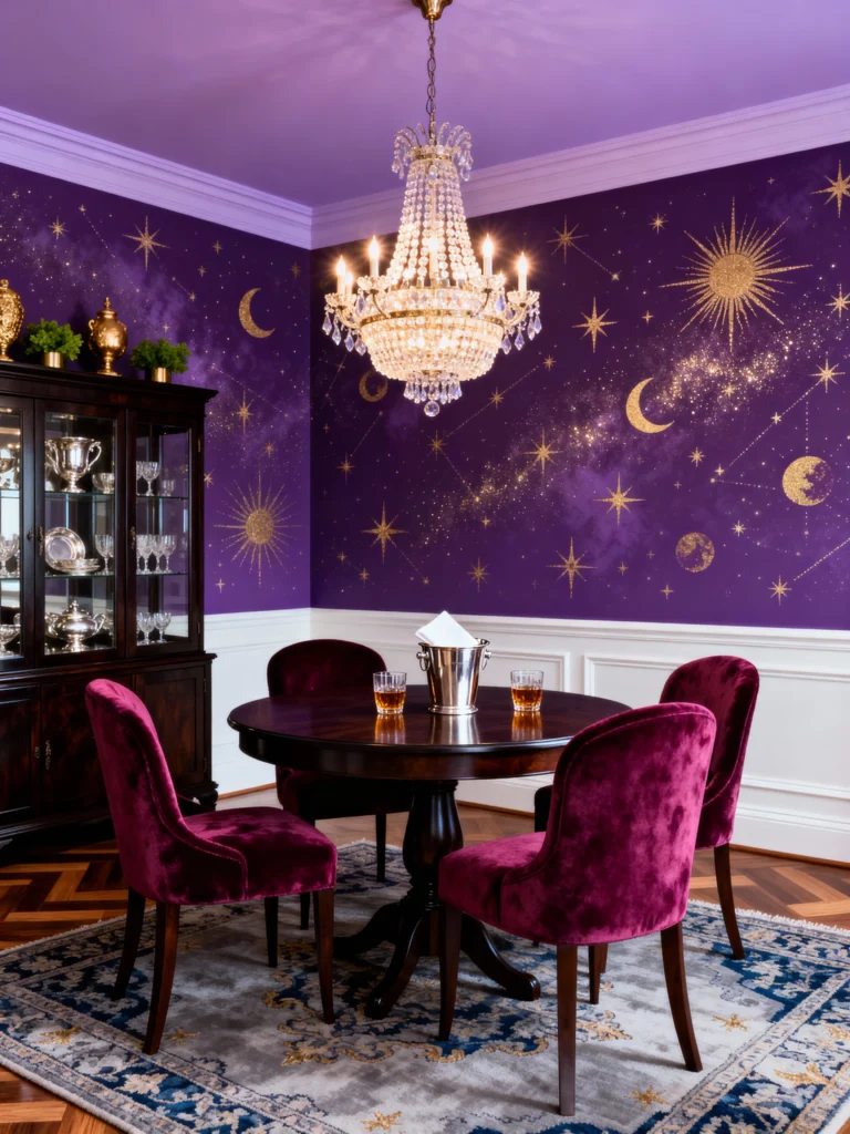 This space is pure magic! The deep purple walls are transformed into a cosmic canvas with beautiful, sparkling gold decals of stars, moons, and constellations—it’s a fun, glamorous take on a classic accent wall. The dining chairs are upholstered in a rich, almost berry-toned velvet, providing that plush texture that elevates any meal. The traditional dark wood table and china cabinet keep the space grounded and formal, preventing it from feeling too thematic. Naturally, a huge crystal chandelier hangs over the table, scattering light around the room. It’s a perfect blend of high-end traditional furniture with a playful, utterly unique modern wall treatment.