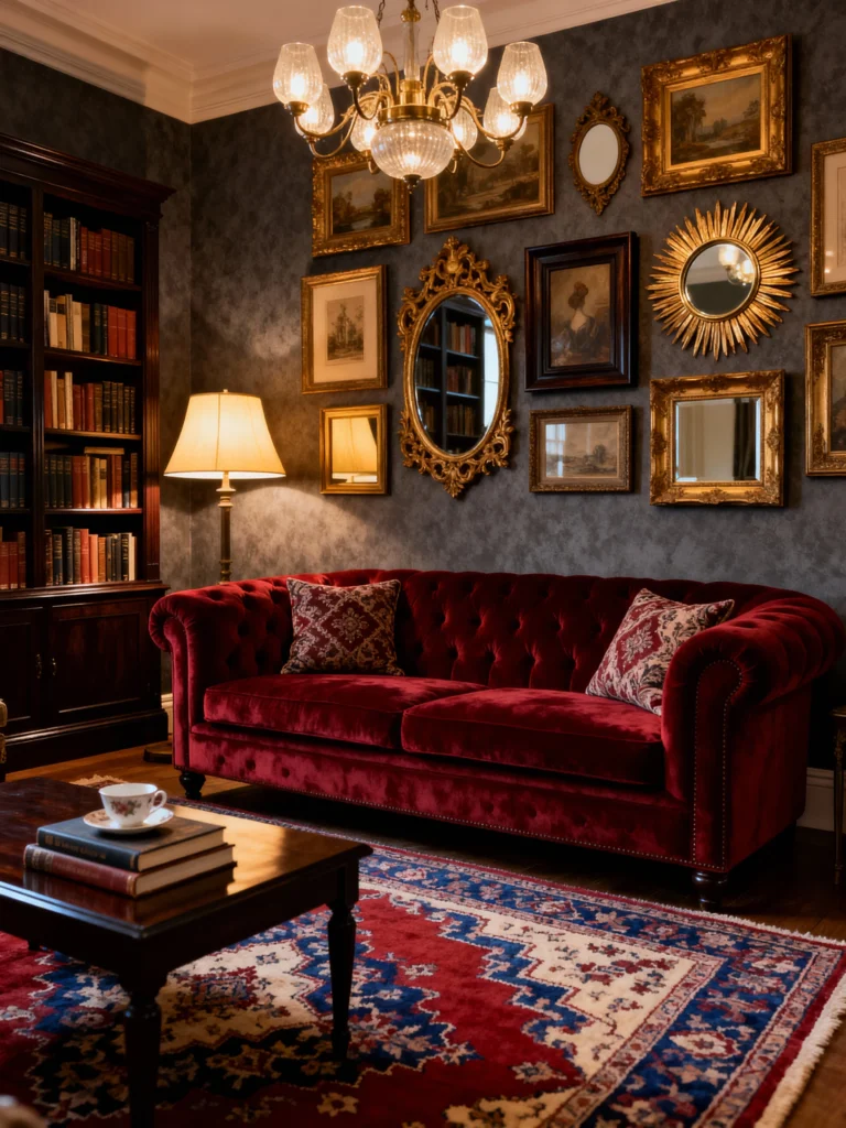 This room gives off major heritage library vibes, but with a pop of passionate color. The dark, textured wallpaper and floor-to-ceiling built-in bookcase create an air of quiet sophistication and scholarly pursuits. And then, there’s that magnificent ruby-red velvet tufted sofa—a classic Chesterfield style that is simply irresistible! The gold picture frames and eclectic gallery wall add so much visual interest, while the large patterned rug brings in coordinating colors like navy, cream, and red. The warm glow from the lamp next to the bookcase just begs you to pick up a book and relax. It’s a truly timeless look that’s both cozy and grand.