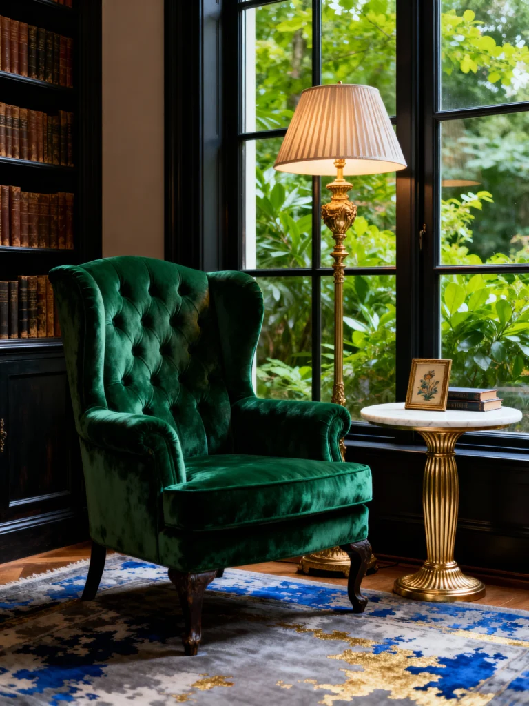 This corner is what I picture when I think of a truly inspiring, peaceful retreat. The beautiful deep emerald green velvet wingback chair commands attention, inviting you to sit and escape the world. Flanked by a large black-framed window and a dark built-in bookcase, the focus is all on comfort and light. The incredible, ornate gold floor lamp and the fluted marble side table introduce a touch of necessary elegance and warmth. The view of the lush greenery outside makes the indoor emerald velvet feel perfectly complementary. It’s a classic, traditional look, yet the strong color and contrasting elements (dark walls, green chair, bright lamp) make it feel completely current.