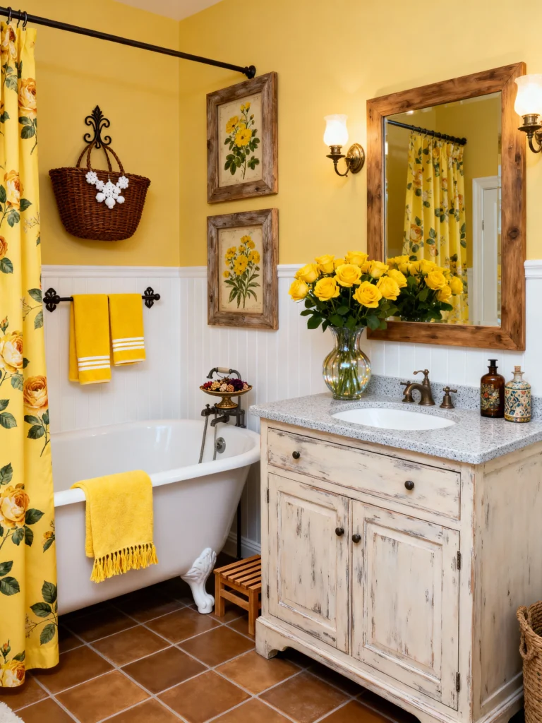 Talk about a burst of sunshine! This bathroom is just pure joy. The vibrant yellow walls and the rich, golden floral pattern on the shower curtain are so uplifting—you can’t help but smile when you look at it. The design masterfully uses white wainscoting to break up the color, making the space feel open and crisp. I adore the antique, distressed vanity and the rustic wooden mirror, which provide that essential cottage warmth. And those finishing touches? The stacked yellow towels, the botanical prints hanging above the tub, and the arrangement of yellow roses on the counter—it’s all perfectly coordinated. This is the ultimate mood-boosting space to start your day!