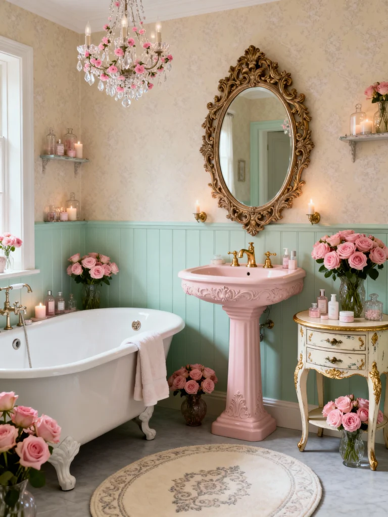 This space is absolutely whimsical. If you’re looking for a bold take on romance, this is it! The combination of the soft yellow-cream textured wallpaper and the mint green beadboard wainscoting is so charming, but the star of the show has to be that beautiful, blush pink pedestal sink. It’s such a unique, glamorous focal point! Everything here screams luxury and detail, from the ornate gold mirror and the matching gold hardware to the stunning pink-studded crystal chandelier. Look at all those lovely little clusters of pink roses and candles—it turns a simple bathroom into a truly magical, spa-like experience.