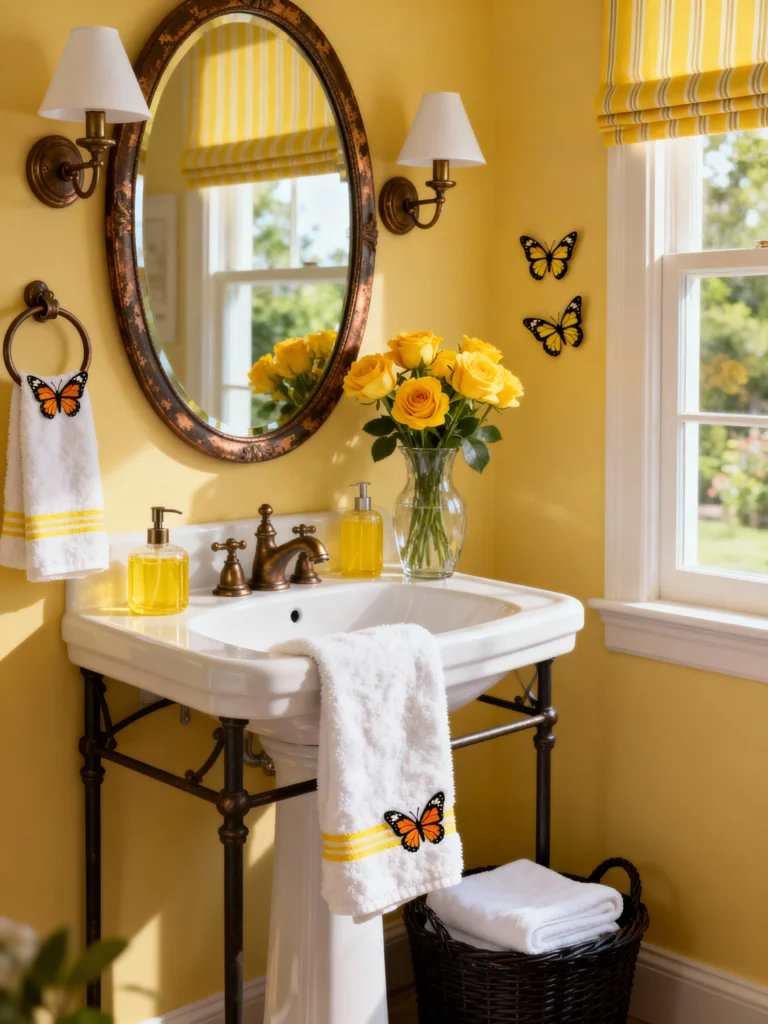 Here’s another great example of how sunny yellow can transform a bathroom into a cheerful haven! This space feels a little more contemporary while still holding onto that sweet, nature-inspired cottage vibe. The simplicity of the yellow walls and the striped window shade keeps things clean and bright. I love the contrast of the white pedestal sink with the dark bronze metal frame and mirror, which gives it a nice grounding element. And the details are everything! The fresh yellow roses are gorgeous, but the little butterfly accents—on the wall and embroidered on the towels—add such a sweet, playful touch. It’s a simple, perfect spot for a refreshing morning routine.