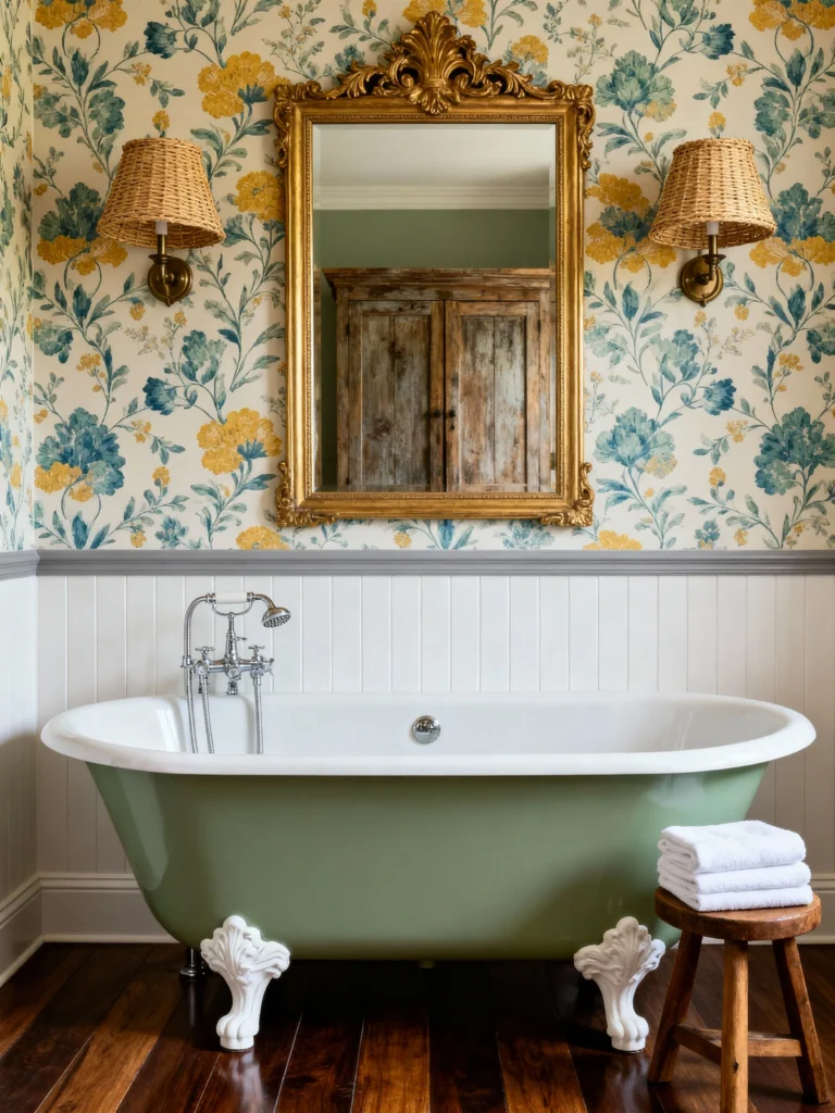 This is my kind of drama! The bold, busy floral wallpaper is the star of this room. The mix of deep yellow and muted blue-green in the pattern against the white wainscoting is a beautiful color combination that feels both traditional and fresh. The deep green clawfoot tub provides a gorgeous, earthy pop of color that perfectly complements the wallpaper. A huge, ornate gold mirror sits above the tub, reflecting light and adding a touch of antique sophistication. I love how they kept the floor a rich dark wood—it’s warm and prevents the space from feeling too light. This is a cozy, elegant take on botanical cottagecore.