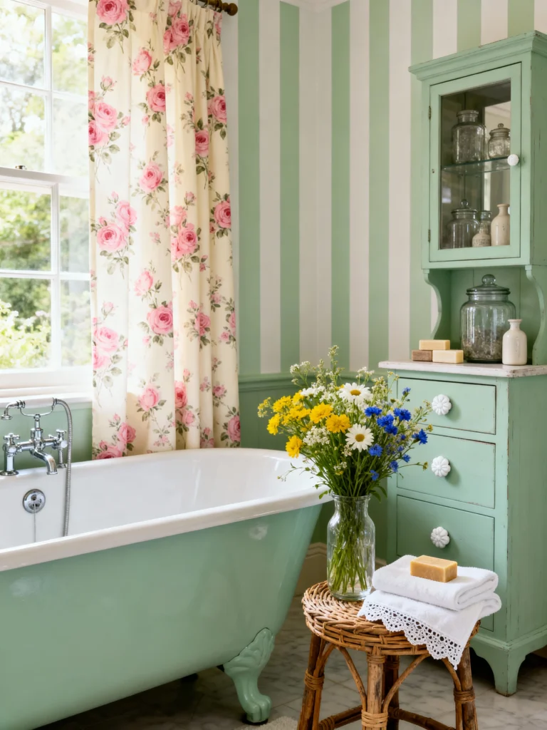 Isn’t this just the sweetest mix? The vertical stripes in soft mint green and white are a fantastic way to add visual height and a playful feel to the space. It pairs so wonderfully with the bold, creamy floral shower curtain—the roses bring in that classic, romantic cottage element. The vintage-style mint green cabinet is an absolute treasure; it’s the perfect piece of statement furniture to house your towels and toiletries. I love how a simple bouquet of wildflowers on the small wicker stool instantly brings nature indoors. This room feels welcoming, collected, and wonderfully relaxed.