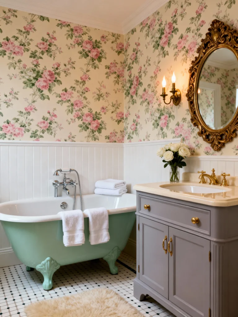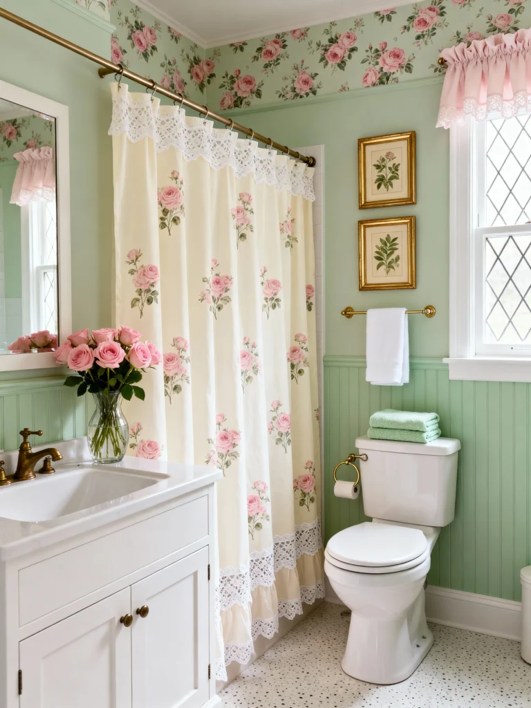 If you’re a fan of subtle, elegant color, this is your inspiration! The light mint green wainscoting and the delicate rose wallpaper above it create an incredibly soft and calming atmosphere. The creamy, lace-trimmed shower curtain with the scattered pink roses ties everything together beautifully. Notice how all the fixtures, like the mirror frame and towel bar, are a warm gold. This choice really makes the room feel sophisticated and traditional. It’s an example of truly classic cottage style that will never look dated. It’s clean, bright, and utterly delightful—a perfect place to unwind!