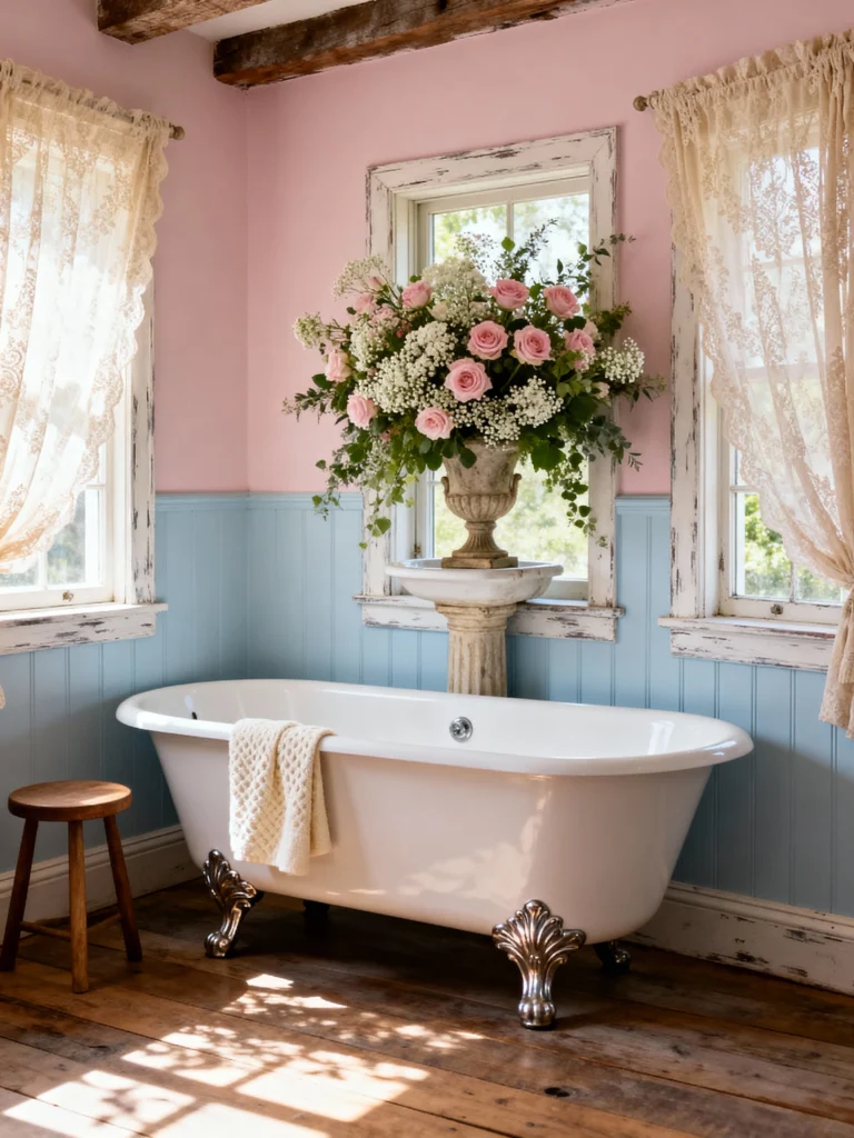 This bathroom manages to be both rustic and incredibly romantic. The combination of the dusty pink upper walls and the distressed baby blue wainscoting is unexpectedly charming, especially against the exposed wooden ceiling beams and plank wood floors. The large windows with their delicate, distressed white trim and lace curtains allow natural light to absolutely flood the space. The silver-footed clawfoot tub is the centerpiece, but the huge, lush floral arrangement on the pedestal in front of the window really elevates the room. It feels like stepping into a sun-drenched, cherished farmhouse from a bygone era.