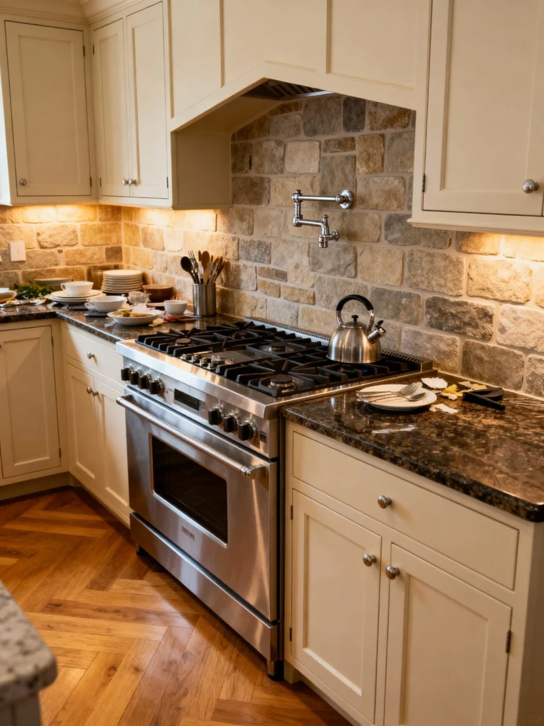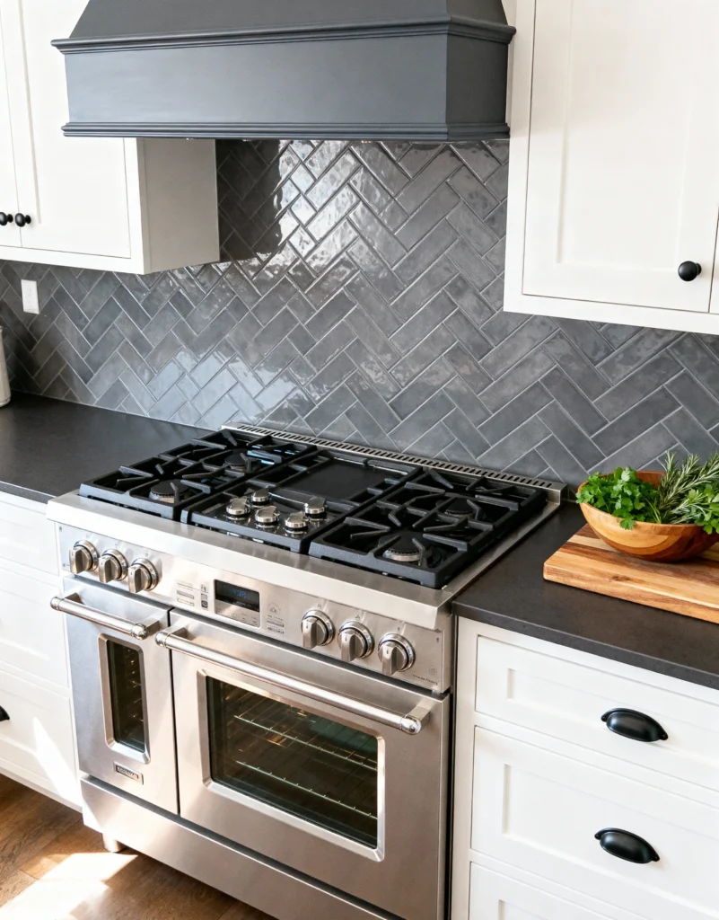 Switching gears for a moment, check out this sleek look! While it’s not stone, this glossy, dark gray subway tile laid in a chic herringbone pattern gives a textured, modern look. The reflective surface contrasts beautifully with the matte dark countertops and the bright white cabinets. The design is clean, contemporary, and the perfect backdrop for that impressive professional-style stainless steel range. This tile choice is a great way to add pattern without overwhelming the space.
