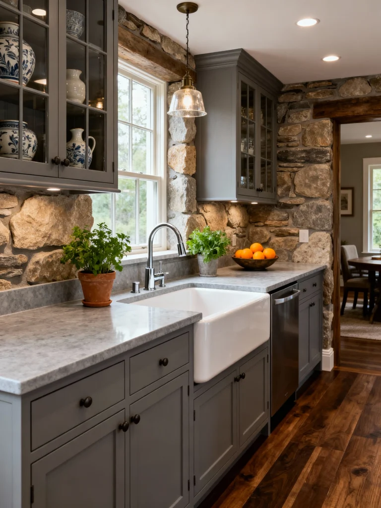 This feels like a perfect, cozy cabin kitchen! The large, rough-cut stone wall provides incredible texture and a sense of history. It wraps beautifully around the window, which frames a lovely view. The gray cabinetry, including the glass-front upper cabinets, provides a cool, sophisticated contrast to the warm stone and dark wood floors. The classic white farmhouse sink and bright stainless faucet tie the look together beautifully—it’s rustic elegance at its best.