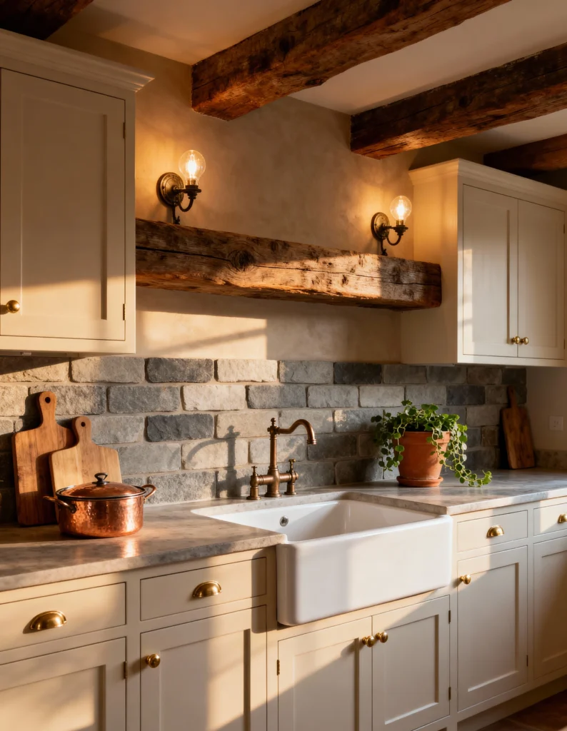 Isn’t this corner just full of charm? The dark, rough-hewn stone backsplash provides an incredible textural contrast to the clean, white cabinetry. I love how the copper-toned faucet and the antique-style cabinet pulls bring in that lovely, aged metallic warmth. And those wall sconces? They cast the perfect cozy glow on the stone, highlighting its rugged beauty. It feels like a perfect blend of farmhouse and rustic cottage style. That classic white farmhouse sink is the cherry on top!